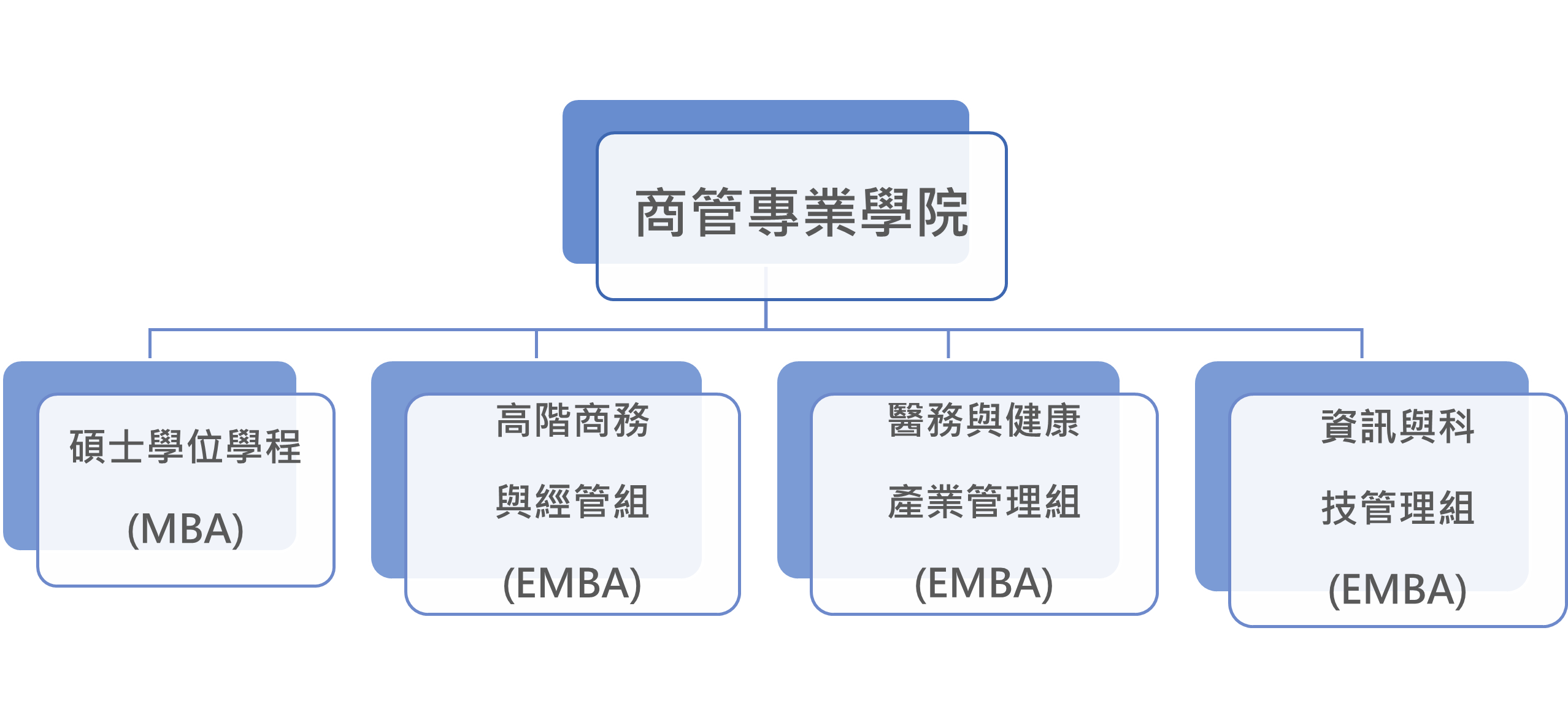 商管專業學院目前有企業管理碩士學位學程 (MBA, Master of Business Administration) 及在職高階經營管理碩士學位學程在職專班 (Executive MBA)三組,分別為: 高階商務與經管組(EMBA in General Management)、醫務與健康產業管理組 (EMBA in Healthcare Management)、資訊與科技管理組 (EMBAin Information Management),組織圖如下所示。商管專業學院碩士學位學程係為專業學位 (professional degree),目標為教授學生管理理論及實務,所招收學生均已在產業界有多年實務工作經驗者,自101學年度起MBA則開始招收應屆畢業學生。